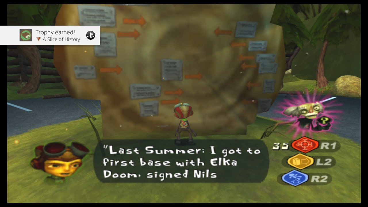 The main story was not the only enjoyable part of the game; the other campers had their own objectives. One hunted for an invisible, hairless bear while another become involved in a squirrel conspiracy (you read that right). Each level had its own distinct feel and mechanics. One level ran like a classic platformer, while another felt like I was steering Godzilla in one of their own movies. Often the new powers would be the central mechanic of the level it was introduced in, while also demanding that the player mastered previous mechanics to progress. I really enjoy the main menu, where you control Raz running on an actual brain to load into your save.